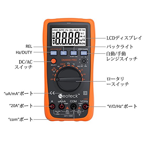 - 【大範囲測定】4000カウント(3・3/4・3999)、AC/DC電圧・電流・抵抗・容量・温度・周波数を測定できます。手動/自動的にレンジを調整できます。TTLロジック測定もできます。