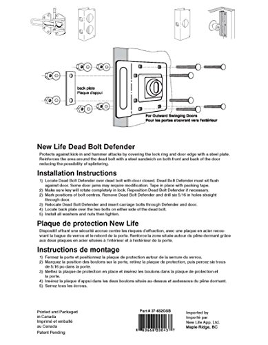 Easy to install, Comes with installation hardware. New Life Deadbolt Defender reinforcer assists in preventing forced entry for outswing doors. Protects against kick-in and hammer attacks by covering the lock ring and door edges with a steel plate. Reinforces the area around the dead bolt with a steel sandwich on both front and back of the door reducing the possibility of splintering. It is easy to install and accommodates key-in deadbolts. Use on wood or metal doors with mortise or drive-in latches. For 1-3/8 in & 2-3/4in. backset and 1-3/8 in, 1-3/4in, any door thickness