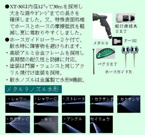 製造国:日本 素材・材質:本体:アルミ鋳物フレーム(アクリル焼付け塗装) 商品サイズ:32×47×39cm 重量:9.5kg 仕様:ノズル:メタル9R(水形9機能)ホース:12mmネット耐圧ホース 散水ホース(30m巻) 補助ホース(2m) 付属品:取扱説明書転倒防止リーフ調ペグセット蛇口接続具(呼び13用)地下水栓用ネジ式プラグ(P-102) ホースガイドローラー2個