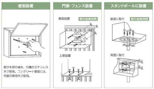 製造国:日本 素材・材質:SUS304ステンレス 商品サイズ:外寸:375×150×300mm、投入口:348×50mm 重量:1.4kg 仕様:表札:シール付鍵:南京錠取付可(別売)取付可能場所 ポールスタンド/背面・底面 外掛壁掛 門扉・フェンス/側面・上部 付属品:ステンレスネジ×4本