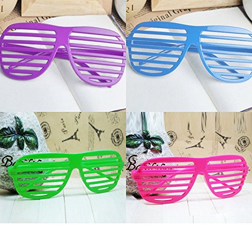 A Party Must-Have - These Shutter Glasses Are Awesome for Any Parties, Especially for 80's Themed. Instantly Set Your Party Apart From Other's!;Super Cool Look - Wear Them to a Road trip, Night club, House party or Anywhere and Become the Center of Everyone's Attention!;Size - 6.5 Wide. Will Fit All Adults and Teens. They Also Look Fun on Kids!;Package Contents - 12 Pairs Shutter SunGlasses. (4 Color in Total, 3 Pairs of Each Color);Authentic Product - Please Look for the [Novelty Place] Logo and Sold ONLY by Novelty Place.