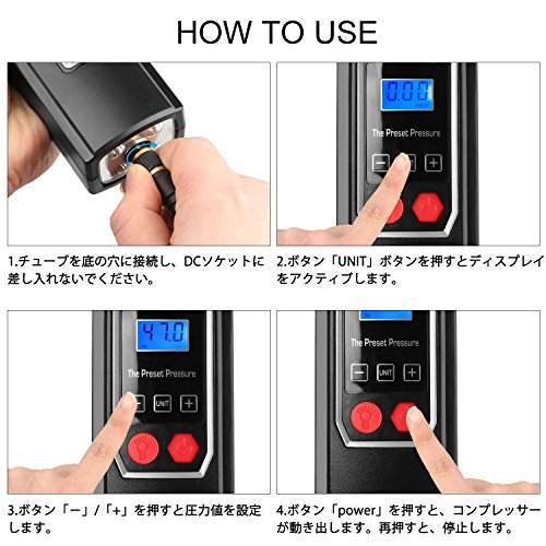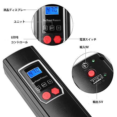 - 【急速充電と空気補充】約1時間半をかかって充電完全となります。自転車には2分ぐらい、またオートバイには約3分をかかってタイヤに空気を入れます。圧力の最大値:150PSI,誤差:0.5PSI