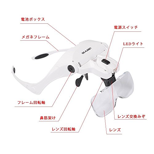 OBEST LEDライトヘッドルーぺ 双眼ヘッドルーペ 倍率異なる5枚レンズ付 1.0倍1.5倍2.0倍2.5倍3.5倍 レンズ交換可能 精密作業用ルーペ ホワイト