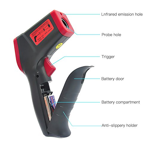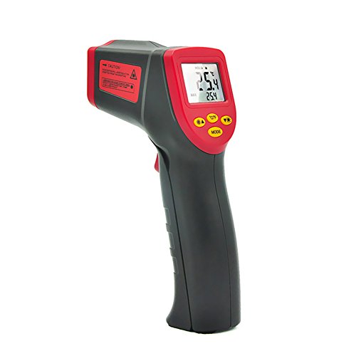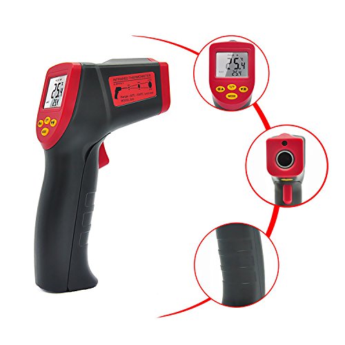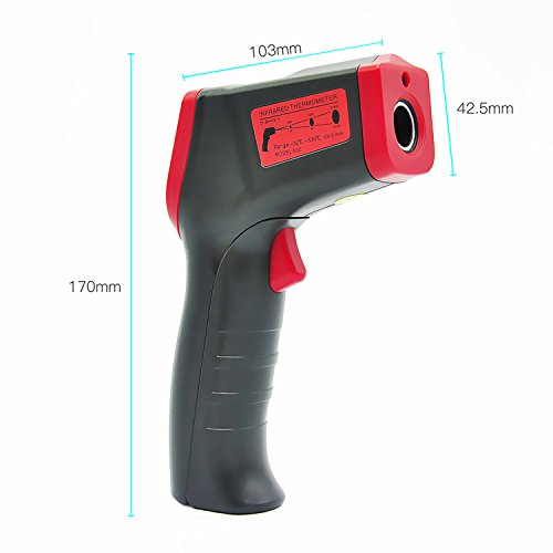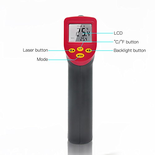 - レーザーポイントで測定範囲の円の中心が分かり、離れるとどこを測定しているのか心配しません。赤外線温度計はバックライト付きの見やすいLCDです。デジタル液晶ディスプレイは、暗いところでも読み取ります。
