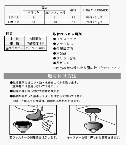 車輪が球体なので360度スムーズに動く。材質は車輪が防錆処理鉄球で、本体はABS樹脂。取り付け・取り外しが簡単なキャスター。