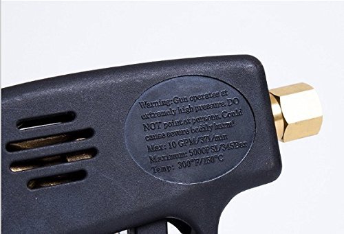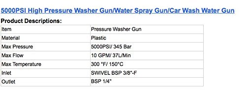 5000PSI High Pressure Washer Gun/Water Spray Gun/Car Wash Water Gun Product Descriptions: Item Pressure Washer Gun Material Plastic Max Pressure 5000PSI/ 345 Bar Max Flow 10 GPM/ 37L/Min Max Temperature 300 °F/ 150°C Inlet SWIVEL BSP 3/8"-F Outlet BSP 1/4"