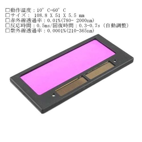 1.溶接面に取り付けをして自動遮光面にできる液晶式の交換レンズです。 2.汎用サイズでお手持ちの溶接面に簡単に取り付け可能です。 3. 面を外して作業の確認をしたい時に、面をしていてもはっきりと作業箇所を確認でますので作業の手間が省けます。 4.液晶レンズ面は、溶接光に瞬時に反応して、電源も太陽電池で電池不要で大変便利です! 製品説明: · 動作温度:10°C-60°C · 赤外線透過率:0.01%(780- 2000nm) · 反応時間:0.5ms/回復時間:0.3-0.7s(自動調整) · 紫外線透過率:0.0001%(210-365nm)