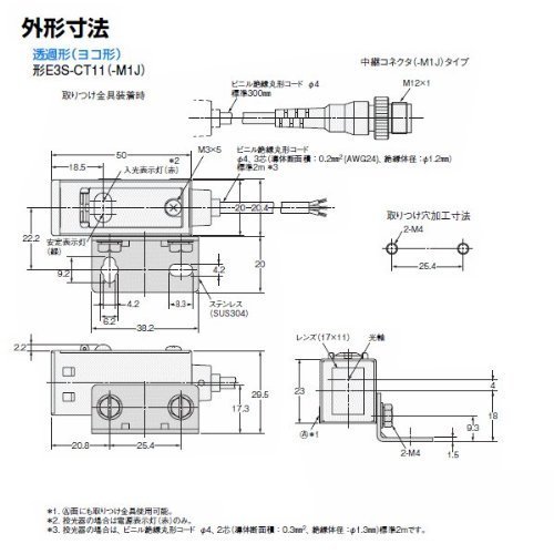 オムロン(OMRON) E3S-CT11-M1J 0.3M 横型 耐油・長距離光電センサ(メタルケース) (透過形・検出距離30m赤外光) (コネクタ中継タイプ 2m) NN