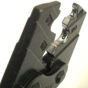 特長 / 圧着端子の装着作業に。圧着された端子を痛める事なく、取りやすい。正確に設計された圧着罫。 圧着後端子に、使用ダイスのサイズが刻印されます。
