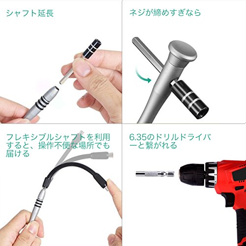 - 【重要特徴】ハンドルには内部收纳機能があり、ドライバービットやネジなどの小さな部品の保管に適しています。延長バーが付け、狭い箇所、先端や深い所が届き難い場所でも使い易い仕様です、細かなパーツやケーブル、基盤などを扱うのにも便利です。更に、電気接続ロッドを55㎜が付き、6.35電動ドライバーで接続できます。