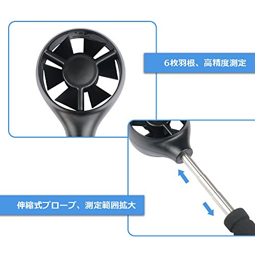- 伸縮式プローブ設計、測定範囲を拡大できます。伸縮長さ:26.5-53.3cm。6枚羽根、通常の風速計より、高精度測定が可能です。