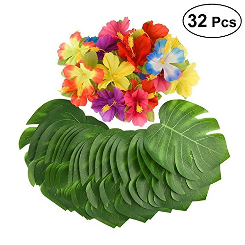 OUNONA 32pcs緑のシミュレーションフラワー人工植物偽のカメの葉は家の装飾を去る(16個の中型のタートルの葉/ 16のハイビスカスの花)