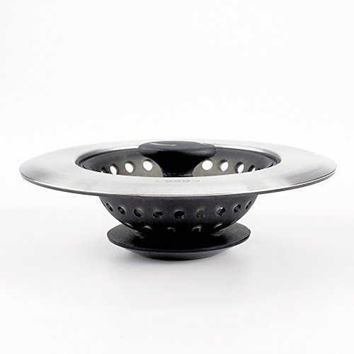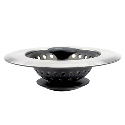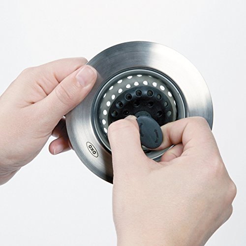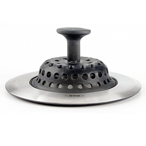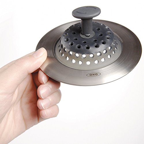 Package Quantity:1 ?|? Size:1-Pack Product Description The OXO Good Grips Silicone Sink Strainer and Stopper combines sleek stainless steel with a flexible, stain-resistant silicone basket and drop-down Stopper. The easy-to-clean silicone basket traps food debris to prevent clogs. To empty the Strainer, simply pick it up by the center post and invert the silicone basket for easy debris removal. To stop the sink to fill it with water, just give the large, comfortable knob a quarter turn in any direction and the Stopper drops down for soaking dishes or pans. You'll know that you've gone from strain to stop or vice versa when the post clicks into place. A silicone underside won’t scratch the sink basin. Brand Story By OXO
