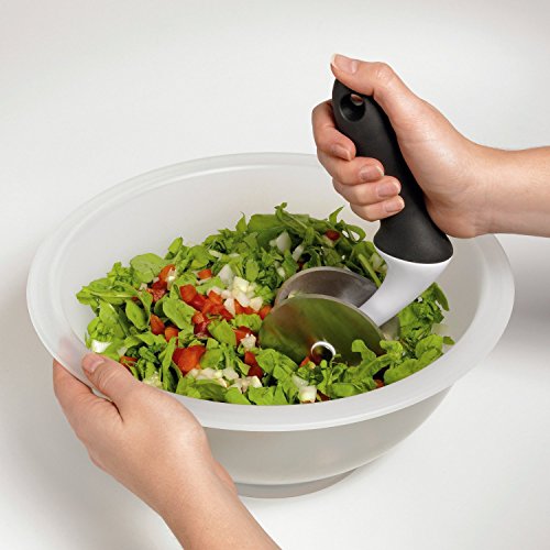 Eating a full day's dose of fresh produce gets easier and quicker with Oxo's two-piece salad chopper set. Designed to let you chop ingredients without transferring them to and from a cutting board, the set includes a rimmed bowl and a rolling chopper hand tool. The tool sports double circular blades made from stainless steel for efficient slicing of greens, veggies, fruit, cheese, and meat. An angled, soft-grip handle makes the work safer and more comfortable. Fashioned from durable white plastic, the bowl has a continuous inner curve to create constant contact with the blades, and its gripper rim simplifies chopping rotation. With a 5-1/2-quart capacity, the set easily cranks out salad for a group, and for easy cleanup, both bowl and chopper go in the dishwasher. Quickly transform everyday vegetables into appetizing and nutritious chopped salads with the OXO Good Grips Salad Chopper and Bow. The Chopper has a soft, nonslip handle and two stainless steel blades that effectively slice lettuce, vegetable, cheese, fruit and more. The Bowl has a continuous curve that is an constant contact with the blades for efficient cutting, and the rim serves as a grip for rotating the bowl while chopping. The Bowl can also be taken directly to the table for serving. Simply assemble salad ingredients in the bow, chop, dress and serve. At 5.5-quart capacity, the Bowl can accommodate up to six servings. Both Salad Chopper and Bowl are dishwasher safe for easy cleaning.