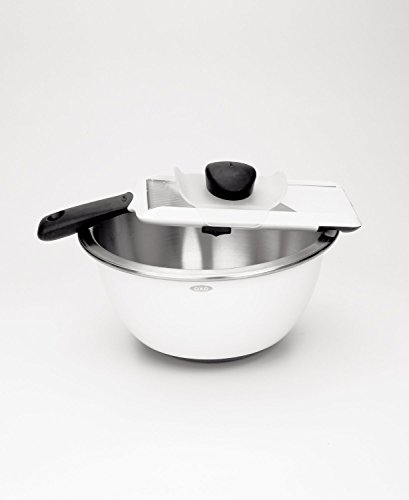 Making cucumber salad, an apple tart or a potato gratin? Try the OXO Good Grips Hand-Held Mandoline. Use the soft knob to simply adjust to the desired slice thickness, and slide the food over the stainless steel blade for perfect, even slices. A clear surface shows slices accumulating below. Slice on a cutting board or plate, or hook the soft foot over a bowl. A food holder protects hands and covers the blade when not in use.