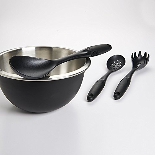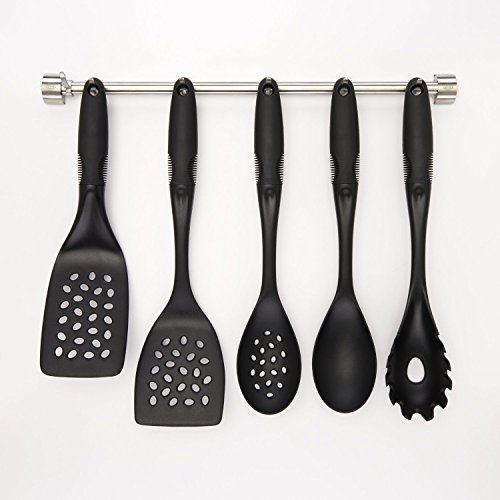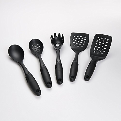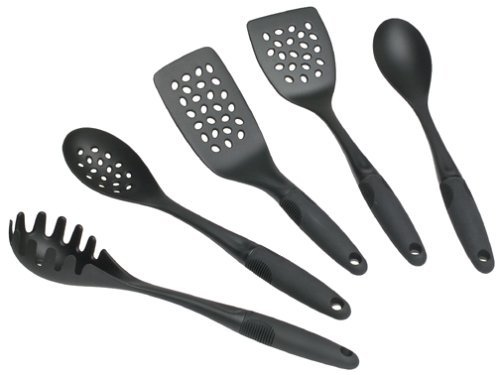 Nylon Tools Protect Nonstick CookwareProtect your nonstick cookware with the OXO Good Grips Nylon Tools Set. Oversized heads, sturdy necks, added length and comfortable grips set these tools apart. The set includes your everyday favorites: Square Turner, Lasagna Turner, Spoon, Slotted Spoon and Spaghetti Server. Each tool features a durable, oversized nylon head that is heat resistant up to 400 degrees Fahrenheit and won't scratch your non-stick cookware. OXO Good Grips Nylon Tool Set::Set comprises five rugged, nylon kitchen toolsSquare turner, lasagna turner, spoon, slotted spoon and spaghetti serverSoft, comfortable, santoprene grips and long handles with oversized headsSafe for nonstick cookwareHeat-resistant to 400 degreesDimensions: Measures 17.9 in. x 7.5 in. x 6.6 in.A Closer Look: The utensils have extra long necks for better reach and their soft handle nestles comfortably in your hand.Take Care: Dishwasher safe.About the Brand: OXO was born in 1990, the first group of 15 OXO Good Grips kitchen tools was introduced to the U.S. market. These ergonomically-designed, trans generational tools set a new standard for the industry and raised the bar of consumer expectation for comfort and performance.