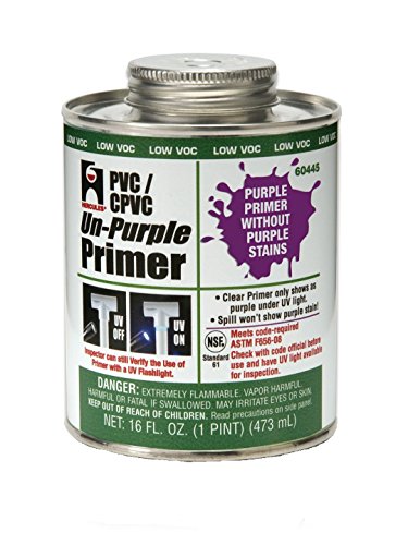 Special purple dye appears clear, purple color revealed only under UV light. For all schedules. Professional grade primer for use on all schedules and classes of PVC pipe and fittings. Special purple dye will appear clear and the purple color will only be revealed under a UV light. Lo-V.O.C. Solvent Cement meets California South Coast Air Quality Management District (SCAQMD) 1168/316A or BAAQMD Method 40 and various environmental requirements. Removes surface dirt, grease and grime as well as softens the pipe surface to allow a fast, secure solvent weld. Meets ASTM F656.