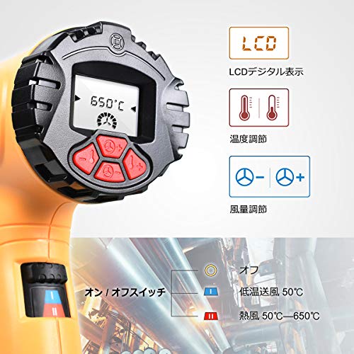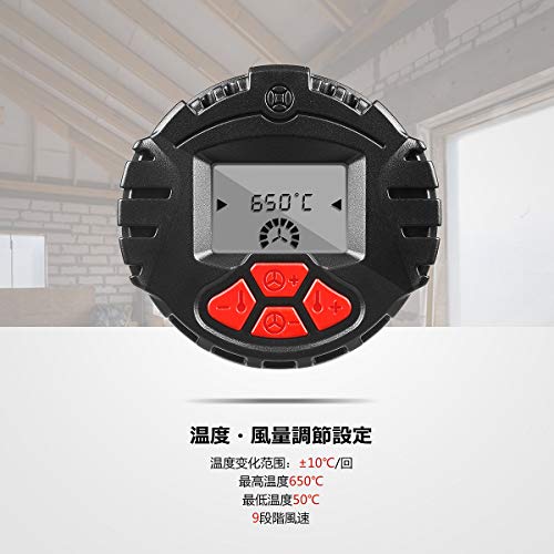 - 【LCDデジタル温度・風量表示】1800W ヒートガンはLCDデジタル表示と強力なパワーがあるので、温度調整が 50℃-650℃ 内で調節でき、モード①:50℃(送風)/モード②:50-650℃(熱風);2つのモードの中に9段階風速が切り替え可能です。作業に合わせて温度・風量をコントロールが可能なので、操作性・生産性の向上に貢献。