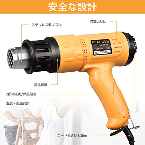 - 【多機能対応】4種類ノズル付き、必要に応じて異なるタイプのノズルも自由に選択することができま。塗装・ステッカー剥がし作業、シュリンクフィルムの収縮作業、熱収縮チューブや塩ビ管などの加工作業、冷蔵庫解凍、雪解けなどの加工作業、及びその他の乾燥・熱加工作業に適用しています。