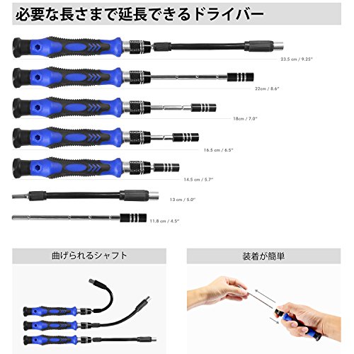 - 【長さ調整可能】ドライバーは必要な長さまで延長できます。狭い場所は曲げられるシャフトを使って、180度で曲げられ、360度で回せます。なかなか届かないところのネジでも簡単に外せます。