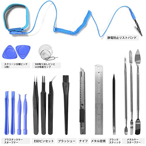 何かを修理したい?このドライバーセットがあればすべてが簡単!ビットを始め、静電防止スリトバンド、SIM取り出しピン、LCD吸着カップ、三角スクリーン分離ピック、メタルケースオープナー、プラスチックケースオープナー、メタル定規、ナイフ、ブラッシュ。必要な道具が全部含められています。このセットがあって他にいるものナシ!