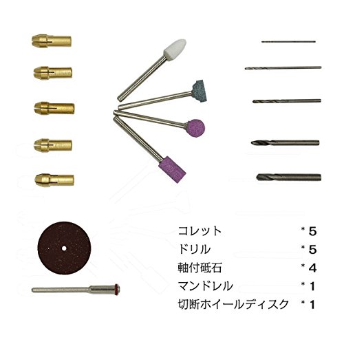 - 「付属品豊富」 豊かな内容:金属用(WA)軸付砥石X4本、ダイヤモンドビットX1本、マンドレルX3本、HSSドリルX5本、コレットX5個 切削デイスクX10個など