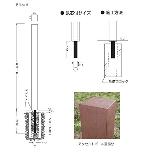 玄関門柱 柱 木製樹脂 人工木材 アクセントポール ブラウン 鉄芯200mm付 H1000 90角柱 フェンス デザイン柱