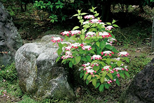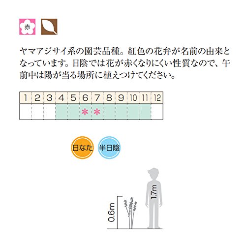ヤマアジサイ系の園芸品種。紅色の花弁が名前の由来となっています。