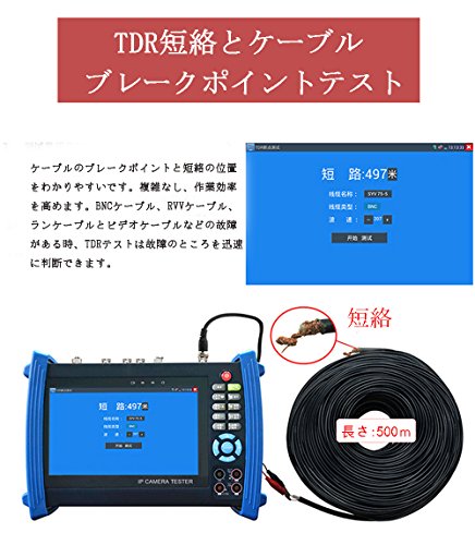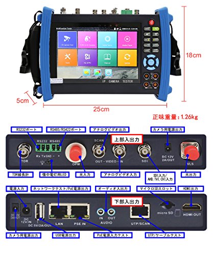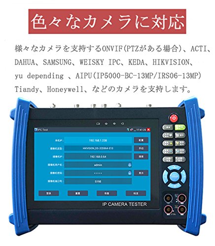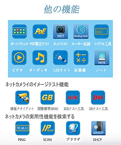 - 大機能:HD-SDI/AHD/IPC/CVBS/CVI/TVI/DMM/OPMを始め様々な規格に対応し,ネットワーク・音声・PTZ信号・LANケーブル導通テスターにも搭載しております。多種多彩な場面にも応えます。Onvif・PoEにも対応します。本機一つで対応できる施工業者様に最適な製品です。