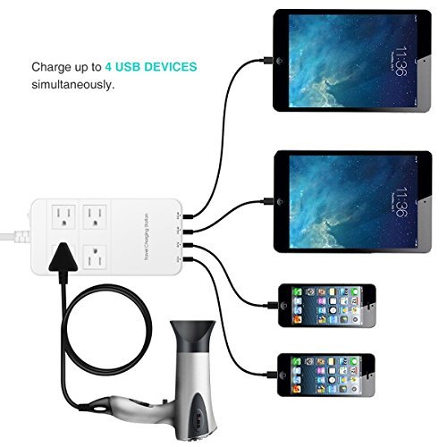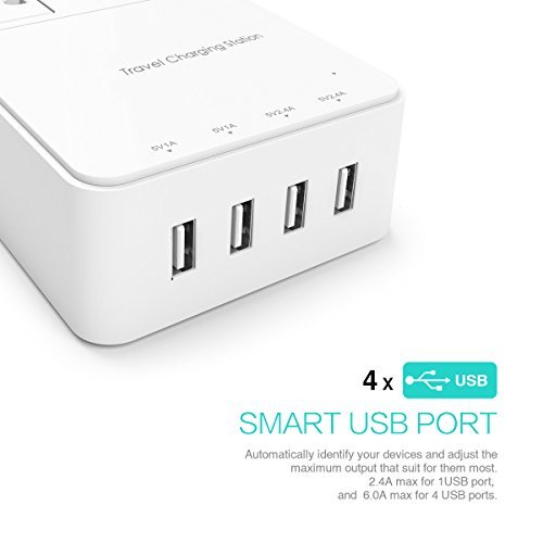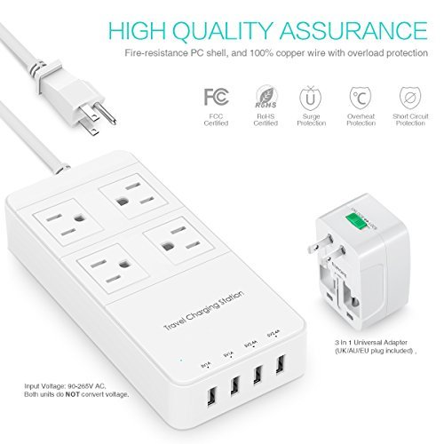 The socket which is made of high rigid and Anti-fire ABS is only applicable to the United States. It has 4 AC outlets and 4 USB charging ports (6.8A Max).