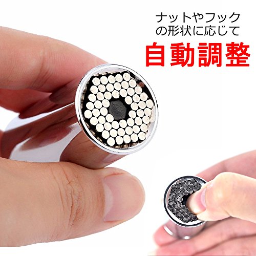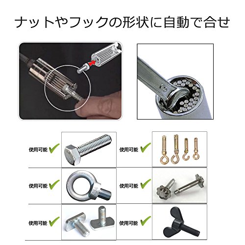 - 万能ソケット:ソケット内部の54本のスチールぴンが三角、四角、六角ナット、トルクスねじ、フックねじ、アイボルトなどの、多角形ねじやナットをがっちりつかみます