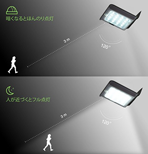 -三つの照明モード:オフ/薄暗い/ブライト;昼間はOFFになります。電力を節約するために、PIRによって薄暗い光と明るい光を切り替えられます。すなわち、薄暗い光は夜間電力が節約できます。PIRモーションセンサーが作動した場合は、約30秒間明るい光に切り替えられます。誰かまたは何かが3〜5メートルや120度の検知角度内の範囲に入るとモーション検知光がトリガされます。