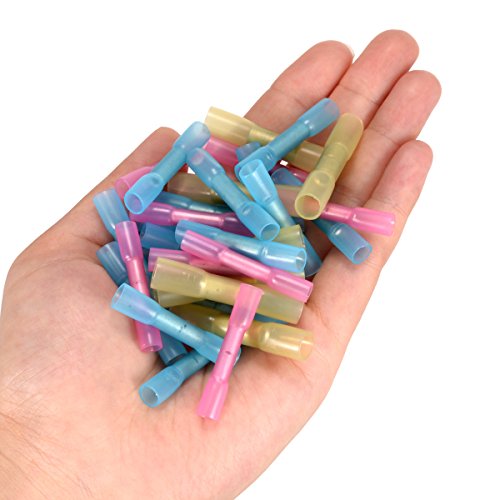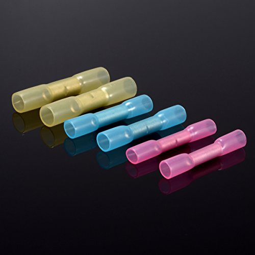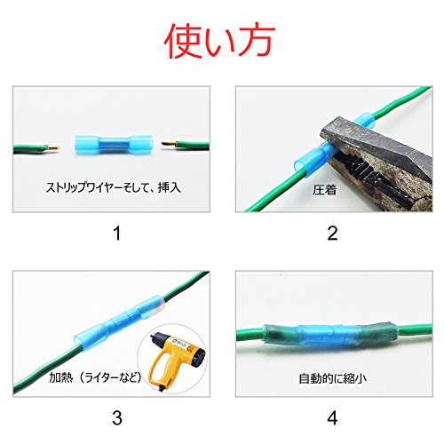 - 熱収縮絶縁コネクターは、引き抜き強度を改善します。接着剤が流れるまでホットエアーガンを使用し、サイズが小さくなり、端子内の隙間を埋める