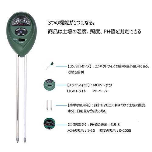 - 簡単な使用法:探針により土に刺すだけで土壌の酸度、水分、日射量などを読み取り、植物の健全な成長を促進する。