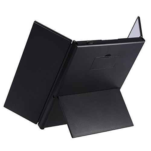 - 収納された状態から観音開きで小さな三面化粧鏡になる点がLED内蔵型としてユニークです。背部のスタンドを開いて立てますが角度は無段階で調節できます。