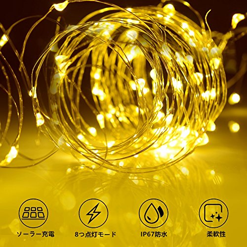 【商品について】 約10メートルの長さに等間隔にLEDが100個付いているので、結構広く飾れます。IP67の防塵・防水性能があるので屋外でも使用可能です。末端にはソーラーパネルが付いており、太陽光で充電できます。8モードの中からお好きなモードを選択出来ます。