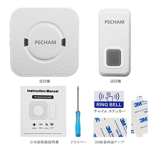 PECHAM ワイヤレスチャイム ドアベル 呼び出し 押ボタン送信器チャイムセット 配線不要 呼び鈴 白