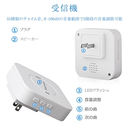 - 【多様な呼び出し音楽&音量調節可能】PECHAMワイヤレスチャイムの呼び出し音が55種類あり、気分によって選択頂けます。そして、受信機は5段階の音量調整が可能、様々な環境と要求を満たします。また、洗練の欧米デザインで、受信機に正面のLEDが青色に点灯しながら呼び出し音楽が鳴り、音と光で知らせるドアベルです。耳が遠い人にも心配ありません。さらに、クリスマスソングや誕生日の歌付きチャイムなので、雰囲気作りもふさわしいです。
