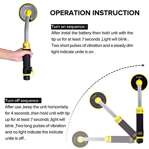 - 簡単に操作:バッテリーを入れ、金属探知器を縦に保持し、ライトが7秒間点滅し、探知機が2回に振動し、ライトが安定になってから起動します。金属を探知すると、2回点滅と振動します。使用後、金属探知器を横に4秒間置いて、縦に少なくとも7秒間保持すると、ライトが点滅し、2回に振動し、ライトが消灯してからオフします。