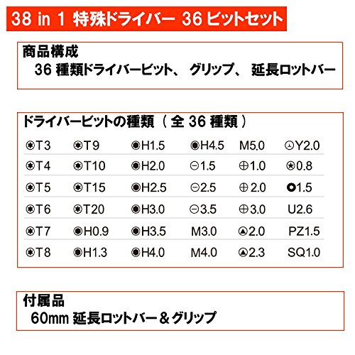 - セット内容:グリップ、延長バー(エクステンションバー)、ビット(36種類)