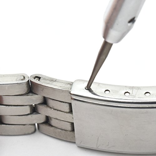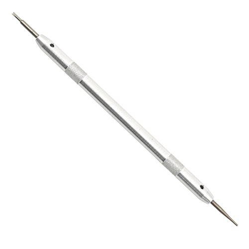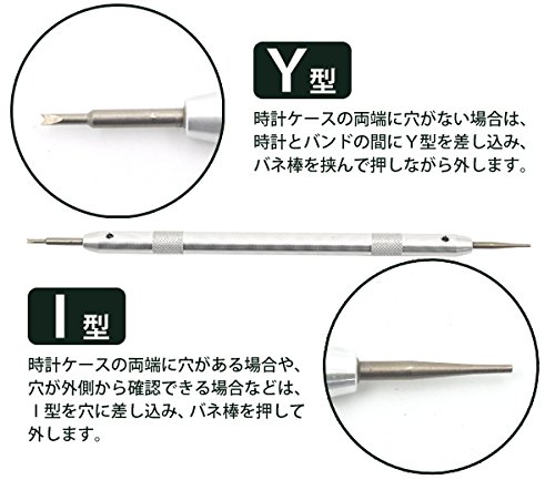 - 多くの腕時計は、ベルトとケース(文字盤)がバネ棒でつながっています。 本製品の両端が二股になったY型と、先端がφ0.8mmのI型になっています。 どちらもバネ棒を押して、ベルトを取り外すために使われます。 I型は、根元まで15mmあるためバネ棒を差し込むベルトの穴に穴通しとして使うこともできます。 穴通しをすると、バネ棒を傷めずにスムーズに差し込むことができます。 ステンレス製なので、先が曲がることもなく摩耗することもありません。