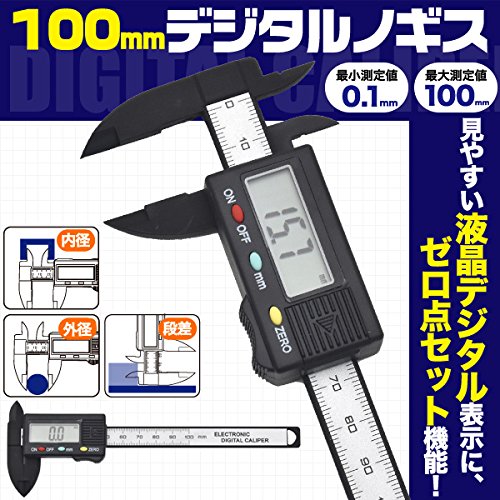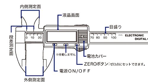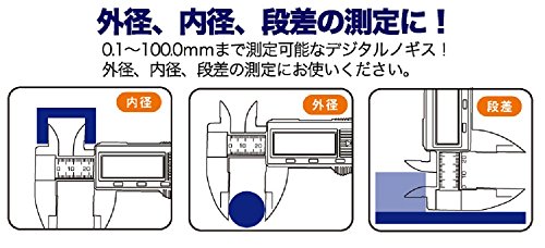 - 外径、内径、段差の測定に! 0.1~100.0mmまで測定可能なデジタルノギス 測定値がデジタル表示されるので、目盛りの読み間違いがありません。ZEROボタンを押せば、ゼロ点にセットすることができて便利です。スライドすると電源がONに、一定時間操作しないと自動で電源がOFFになります。