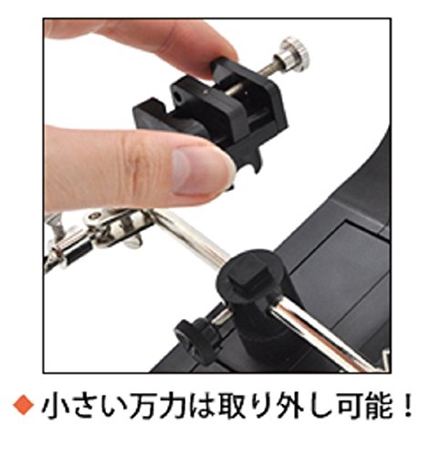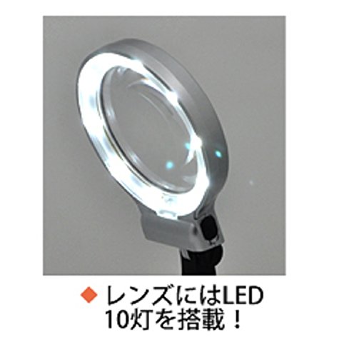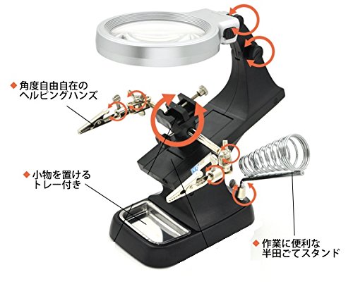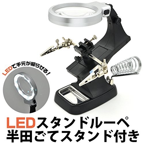 - 半田付けなどの精密作業には欠かせない、半田ごてスタンドのついたLEDスタンドルーペ。ルーペにLEDを搭載しているので作業時に手元が暗くなりません。ルーペは倍率3倍、補強レンズは倍率4.5倍です。