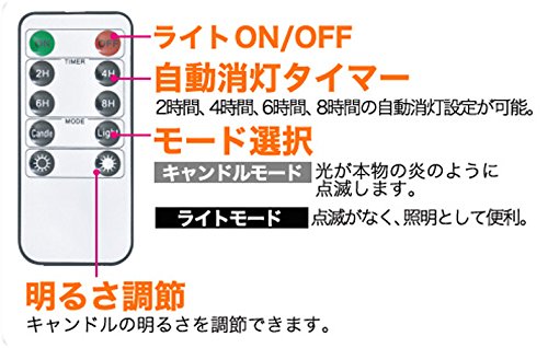 - 本物の火のように灯りがゆらゆら揺れるLEDキャンドル。LEDなので火傷の心配もなく安心・安全にお使いいただけます。リモコン付きで、 離れた場所からも操作可能! 4パターンの自動消灯タイマーや点滅/点灯切替、明るさ調節が可能です!