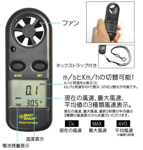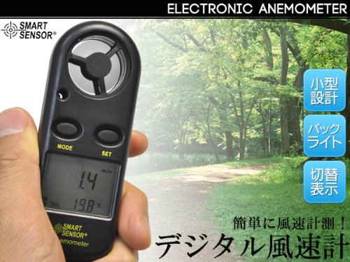 ■手軽に使用できる簡単操作のコンパクトデジタル風速計!<br>手軽に使用できるコンパクトデジタル風速計。作業現場・漁業・農業・スポーツなど、幅広い風速測定にお勧めします。<br><br>■m/sとKm/hの測定単位切替可能!<br>m/s(秒速)、km/h(時速)、の測定単位の切り替えが可能!<br>海外表示のmph(マイル)とKnots(ノット)への切り替えもできます。<br><br>■現在の風速、最大風速、平均値の3種類の風速表示!<br>現在の風速、最大風速表示、平均値表示の3種類の風速表示からお選びいただけます。<br><br>■固定表示機能!<br>数値を固定表示するHOLD機能付き。<br><br>■便利な電池残量表示!<br>便利な電池残量表示付きです。<br><br>■持ち運びに便利な手のひらサイズ!<br>わずか約16cmの手のひらサイズ!持ち運びに最適です。<br><br>■バックライト付き液晶!<br>液晶にバックライトを搭載しているので、暗闇でも確認可能です。 <br><br>■測定部回転可能!<br>測定部は90°回転可能!測定したい向きに調整しやすくなっています。<br><br>