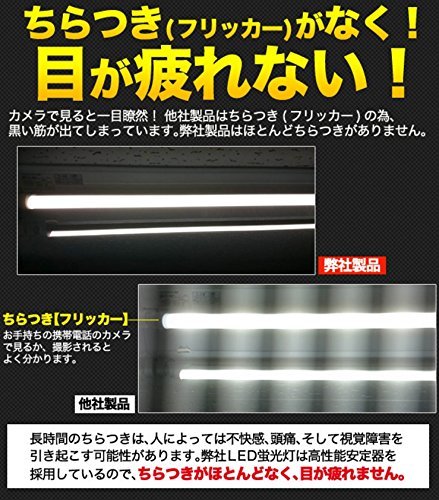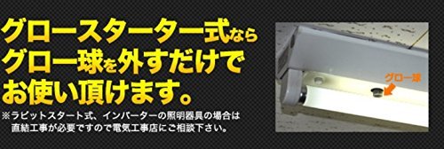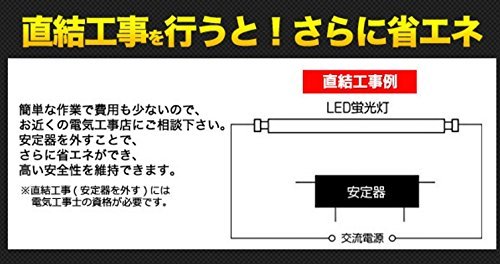 - 直結工事が必要になります。(インバーター方式、ラピットスタート式)※グロー球を外してご使用になられた場合、安定器の相性や安定器が古い等の理由により、チラつく時があります。 その場合は直結工事をしてください。 ※直結工事(安定器を外す)には電気工事士の資格が必要です。 簡単な作業で費用も少ないので、お近くの電気工事店にご相談下さい。 最近では工事の要らない商品もありますが、安定器を外すことで、さらに省エネができ、高い安全性を維持できます。