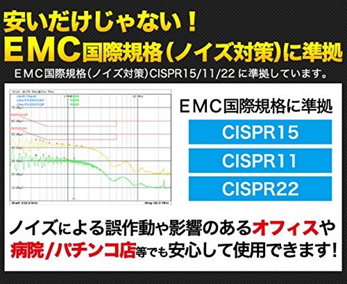 - EMC国際規格(ノイズ対策)CISPR15/11/22に準拠。ノイズによる誤作動や影響のあるオフィスや病院/パチンコ店等でも安心して使用できます!