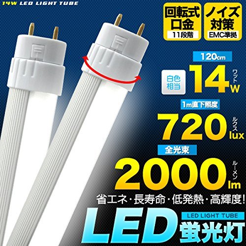 - 全長】119.8cm(40W型) 【消費電力】14W 【1m直下照度】720lux 【全光束】2000lm 【演色評価指数】Ra82 【照射角度】160° 【色温度】5000K 【入力】AC100-220V 50/60Hz 【LEDチップ寿命】40000時間 【LEDチップ】SMD2835 【重量】300g