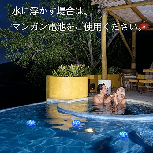- マルチカラーライト:全16色のマルチライトに加え、4パターンのグラデーション機能付きで、多彩なライトバリエーションをお楽しみいただけます。 本商品を水中、底でご利用の場合は、アルカリ電池をご使用ください。また、水面に浮かべる際には、マンガン電池のご使用をお願いいたします。