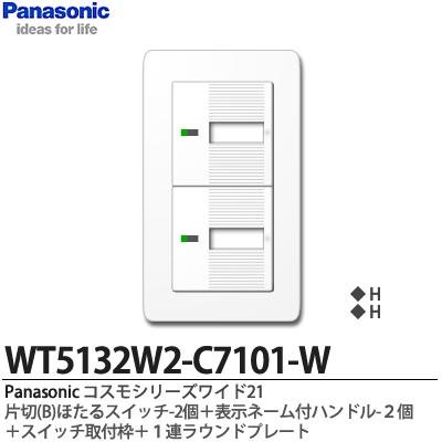 【Panasonic】コスモシリーズワイド21(スイッチ・プレート組み合わせセット)片切(B)ほたるスイッチ2個+表示ネーム付ハンドル2個+スイッチ取付枠+1連ラウンドプレート WT5132W2-C7101-W
